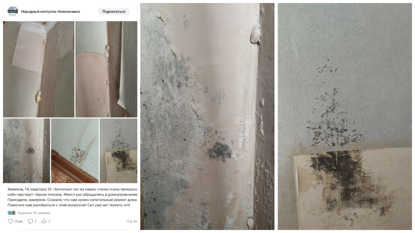 «Химиков, 14, квартира 36. Несколько лет на наших стенах очень прекрасно себя чувствует чёрная плесень. Много раз обращались в домоуправление. Приходили, замеряли. Сказали, что нам нужен капитальный ремонт дома. Помогите нам разобраться с этим вопросом! Сил уже нет терпеть это!», - написано в сообществе.
