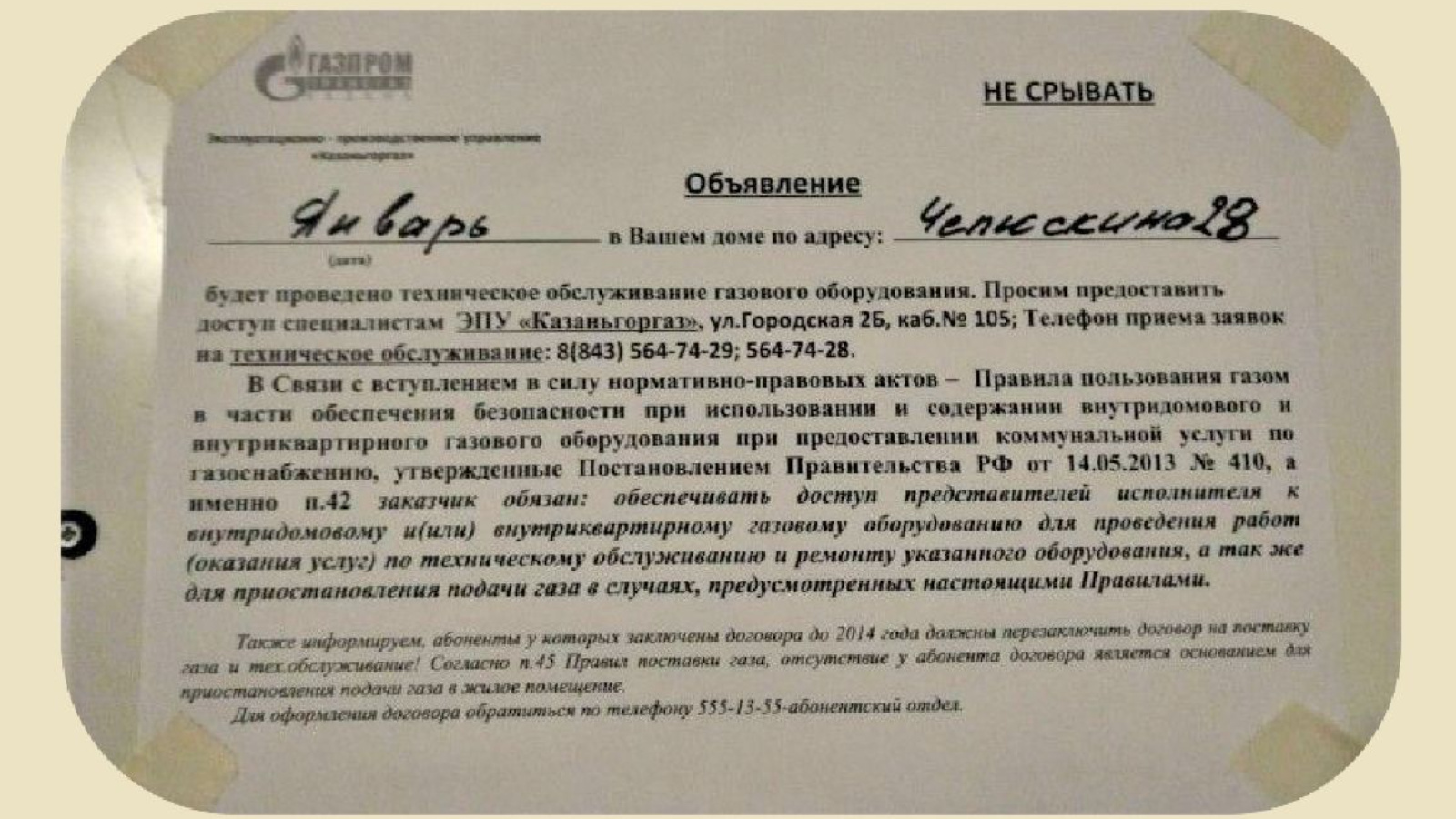 На доске объявлений в доме №28 по ул. Челюскина в столице республики размещено объявление о проведении техобслуживания газового оборудования.