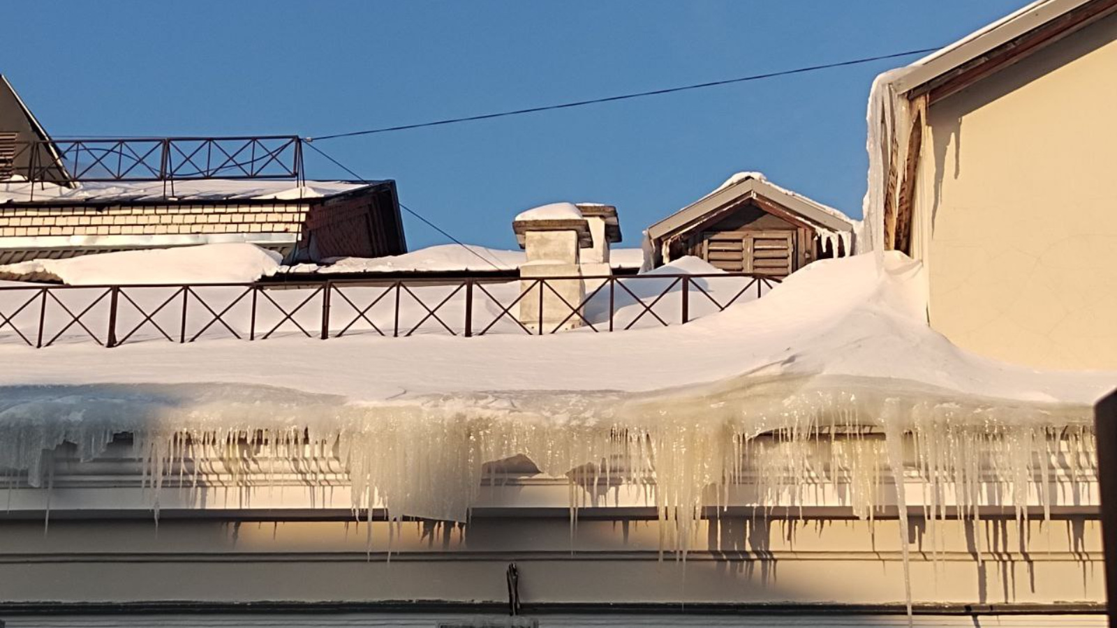 Проверка не ограничилась двумя домами. Сотрудники надзорных органов также посетили дом №9 по ул. Сельхозтехника, где ситуация оказалась не лучше. Двор был завален снегом, тротуары и дороги покрыты наледью, а на крыше висели сосульки и лежали снежные шапки.