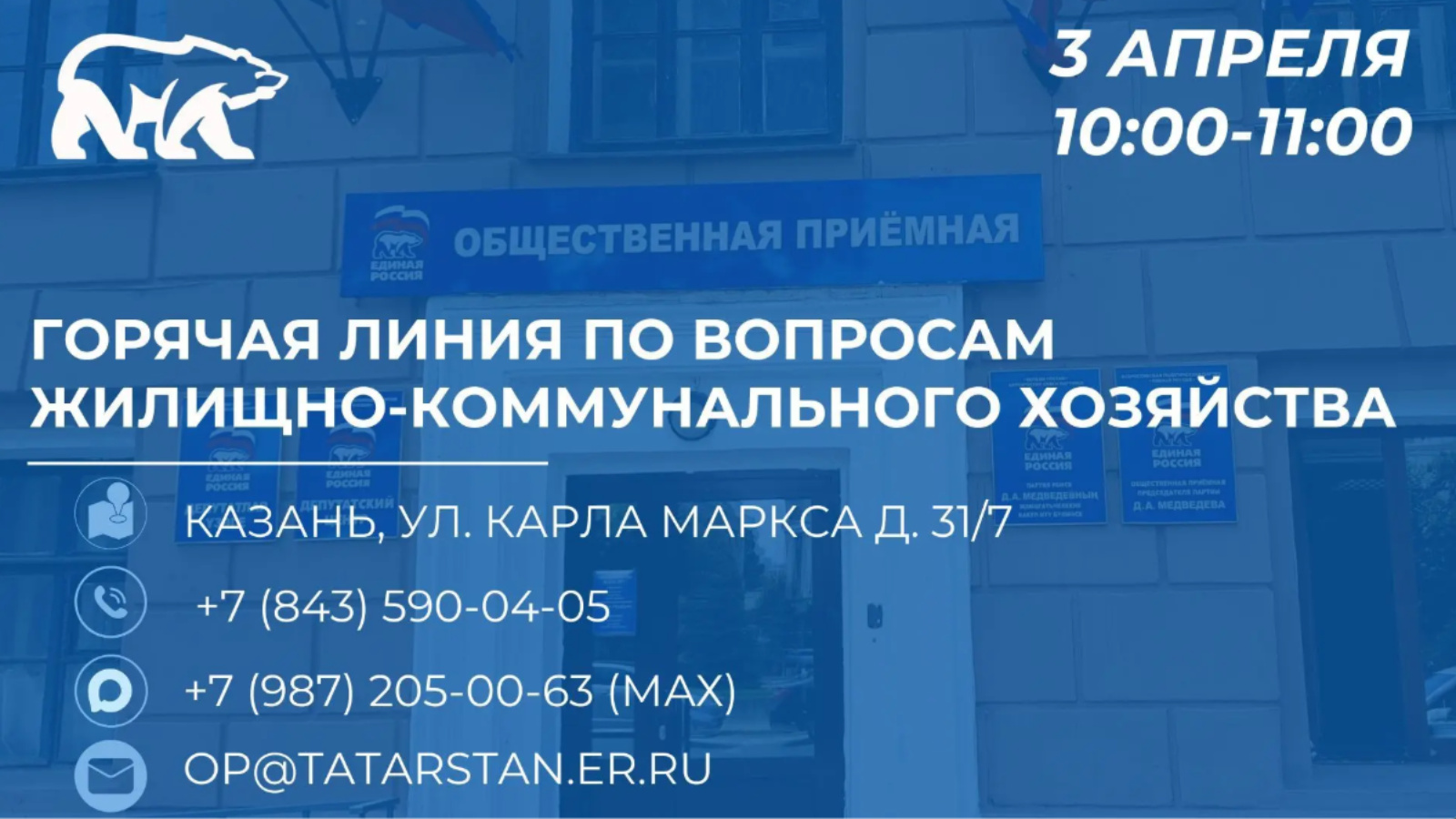 Завтра 3 апреля с 10:00 до 11:00 на площадке Региональной общественной приемной Председателя Партии «Единая Россия» Дмитрия Медведева в Республике Татарстан будет работать горячая линия по вопросам жилищно-коммунального хозяйства.
