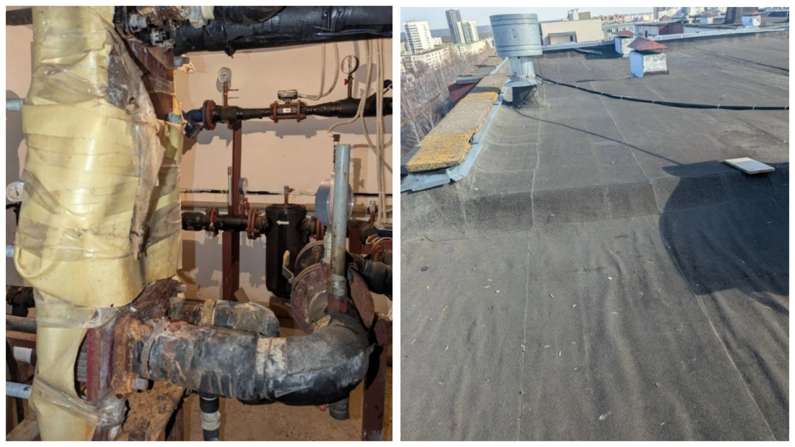 Второй случай касался дома №32/42 по тому же проспекту. Здесь жильцы верхних этажей столкнулись с проблемой затопления квартир. Причиной тому стали многочисленные дефекты кровли: трещины, нарушение герметичности покрытия и примыканий кровли к парапету. Также выявлена негерметичность швов на техническом этаже над кухней квартиры заявителя. Затопление распространяется и на лестничные площадки, что приводит к отслоению отделки стен.