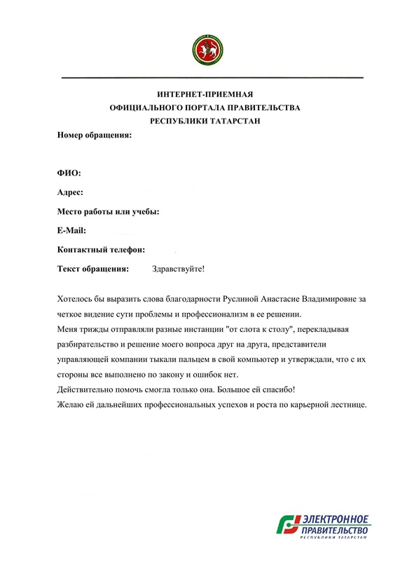 В адрес ГЖИ РТ поступило благодарственное письмо на имя Начальника Государственной жилищной инспекции Республики Татарстан – Главного государственного жилищного инспектора Республики Татарстан - Сергея Аркадьевича Крайнова от жителя дома по адрес: г. Казань, ул. Чистопольская д. 72 И.Н.Морозовой.