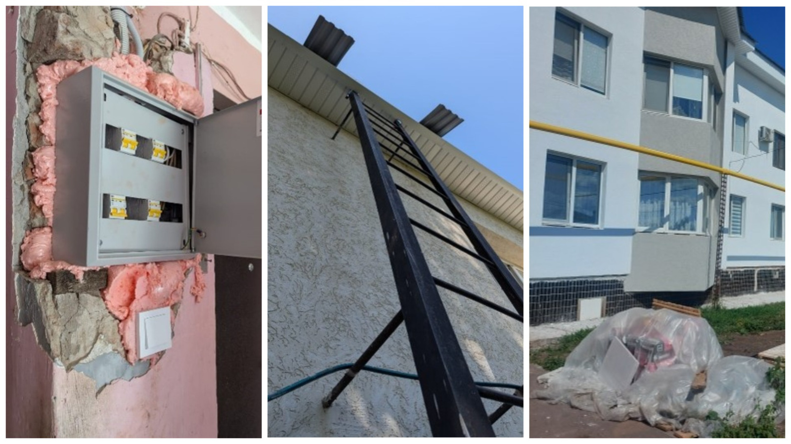 Яңа Троицкийда барлык ремонт пунктларында: түбә, фасад һәм электр белән тәэмин итүдә хокук бозулар бар. Ленин урамындагы 1 нче йортта электр щиткаларын монтаж күбегенә утыртканнар, өстәмә беркетүләрсез генә.
