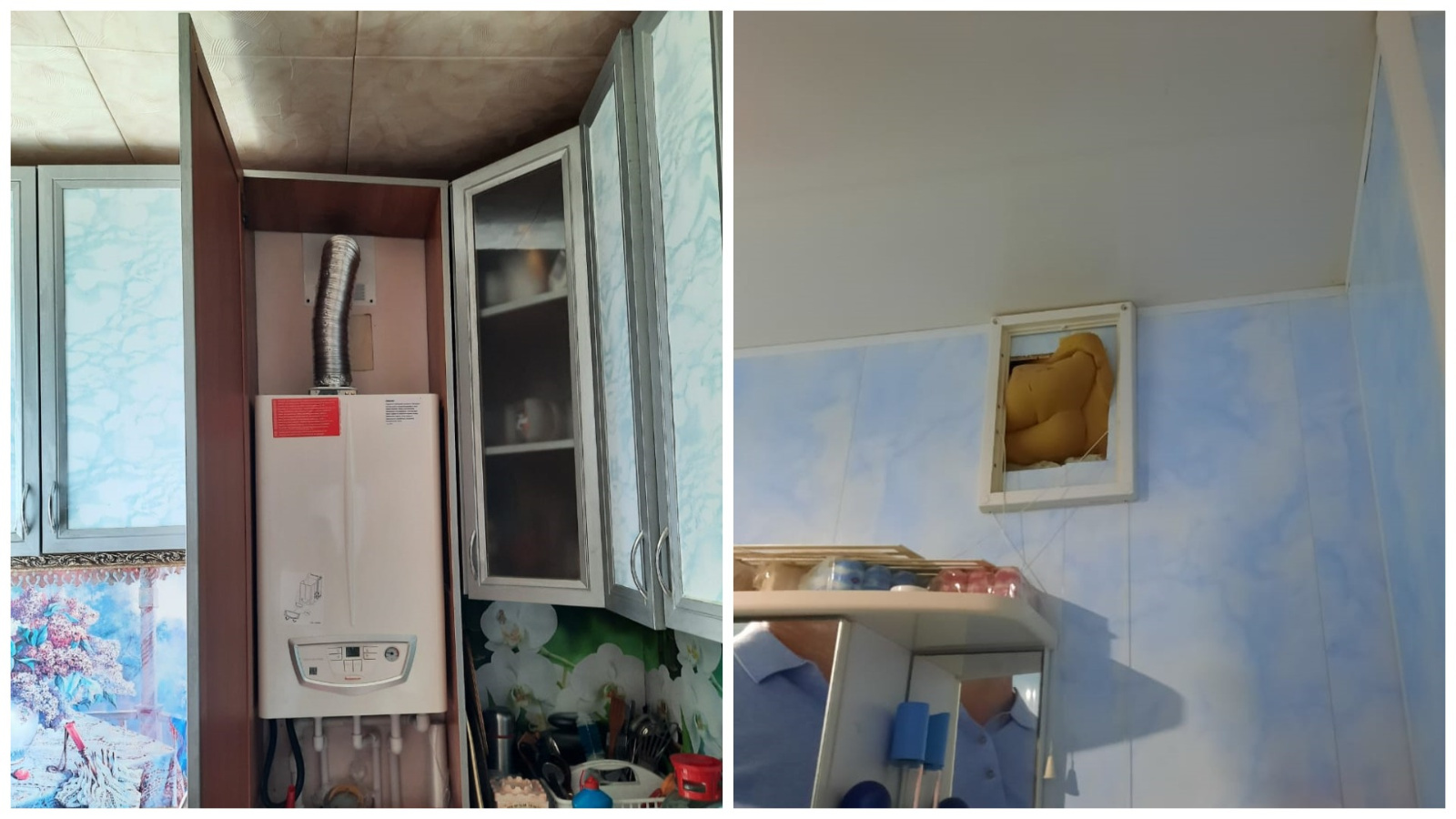 Күпфатирлы йорт. Аш бүлмәсе. Вентиляция каналлары чүпрәкләр, поролон, обой һәм мебель белән капланган. Ике контурлы казаннар кухня шкафларына урнаштырылган. Тәрәзәләре пластиктан.