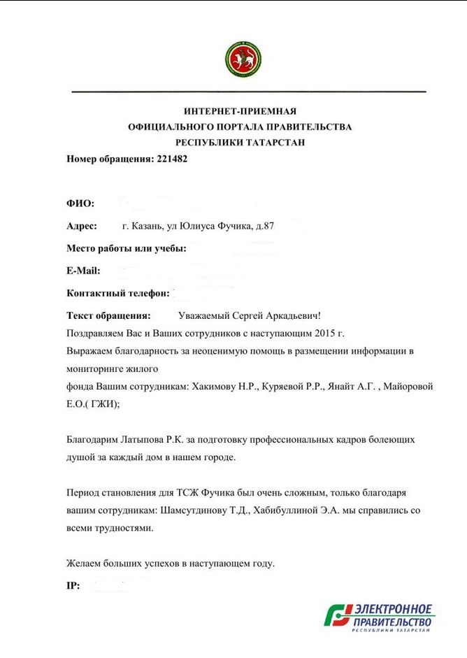 ТР ДТИ хезмәткәрләренә карата Татарстан Республикасы Дәүләт торак инспекциясе Башлыгы - Татарстан Республикасының Баш дәүләт торак инспекторы - Сергей Аркадьевич Крайнов исеменә Казан шәһәренең Ю.Фучик урамы буенча 87 нче йортта яшәүчеләрдән рәхмәт хаты ирештерелде.